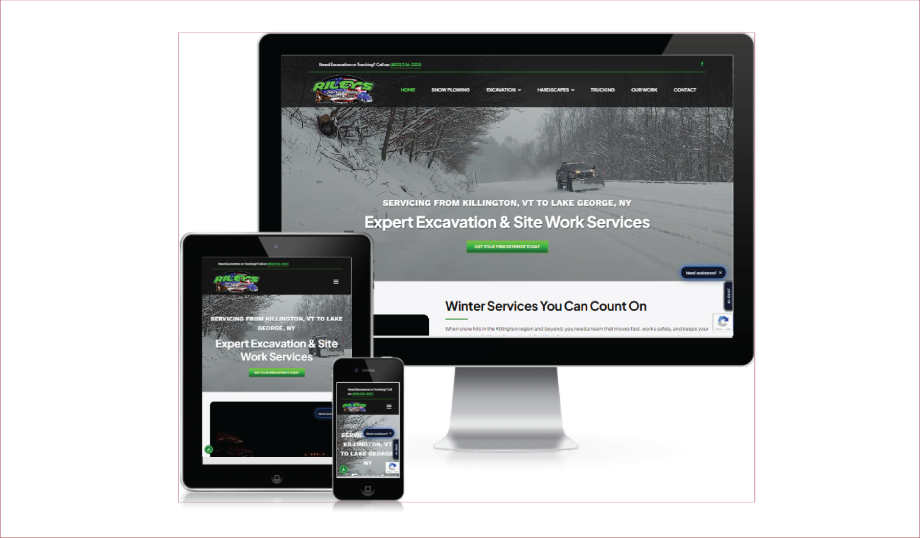 The website designed by Capital District Digital gives Riley’s Excavation a strong, professional online foundation that clearly reflects the wide range of services they offer. With a clean, organized layout and intuitive navigation, visitors can easily explore core services like excavation, hardscaping, trucking, and winter care. The design incorporates high-quality visuals, clear service descriptions, and prominent contact points (including a “Get Your Free Estimate” call-to-action) to encourage inquiries and conversions. From an SEO perspective, strategic use of location-specific and service-focused keywords (e.g., “excavation Killington VT”, “site grading Rutland County”, “foundation excavation Vermont”) helps the site attract targeted local traffic from property owners and contractors searching online for dependable excavation and site-work services. Together, the design and SEO strategy support Riley’s business goals by enhancing visibility, driving qualified leads, and reinforcing their reputation for reliable, locally rooted service.